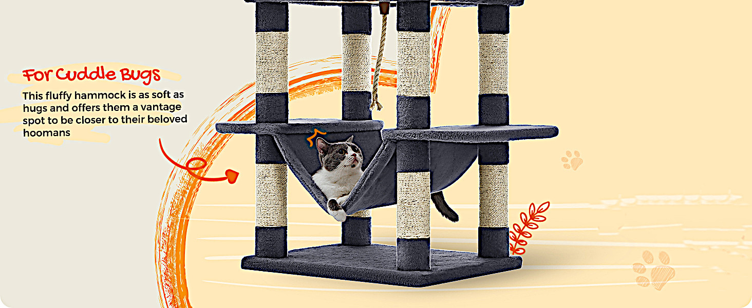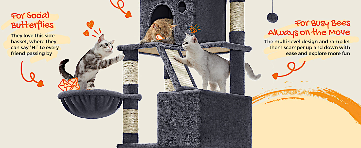 Whether your cat loves to perch and watch the world, curl up in a private hideaway, or swing lazily in a hammock, this tower has it all. With 2 padded perches, 2 cozy caves, a fluffy basket, a hammock, and playful pompoms, every feline in the house will find their favorite spot.