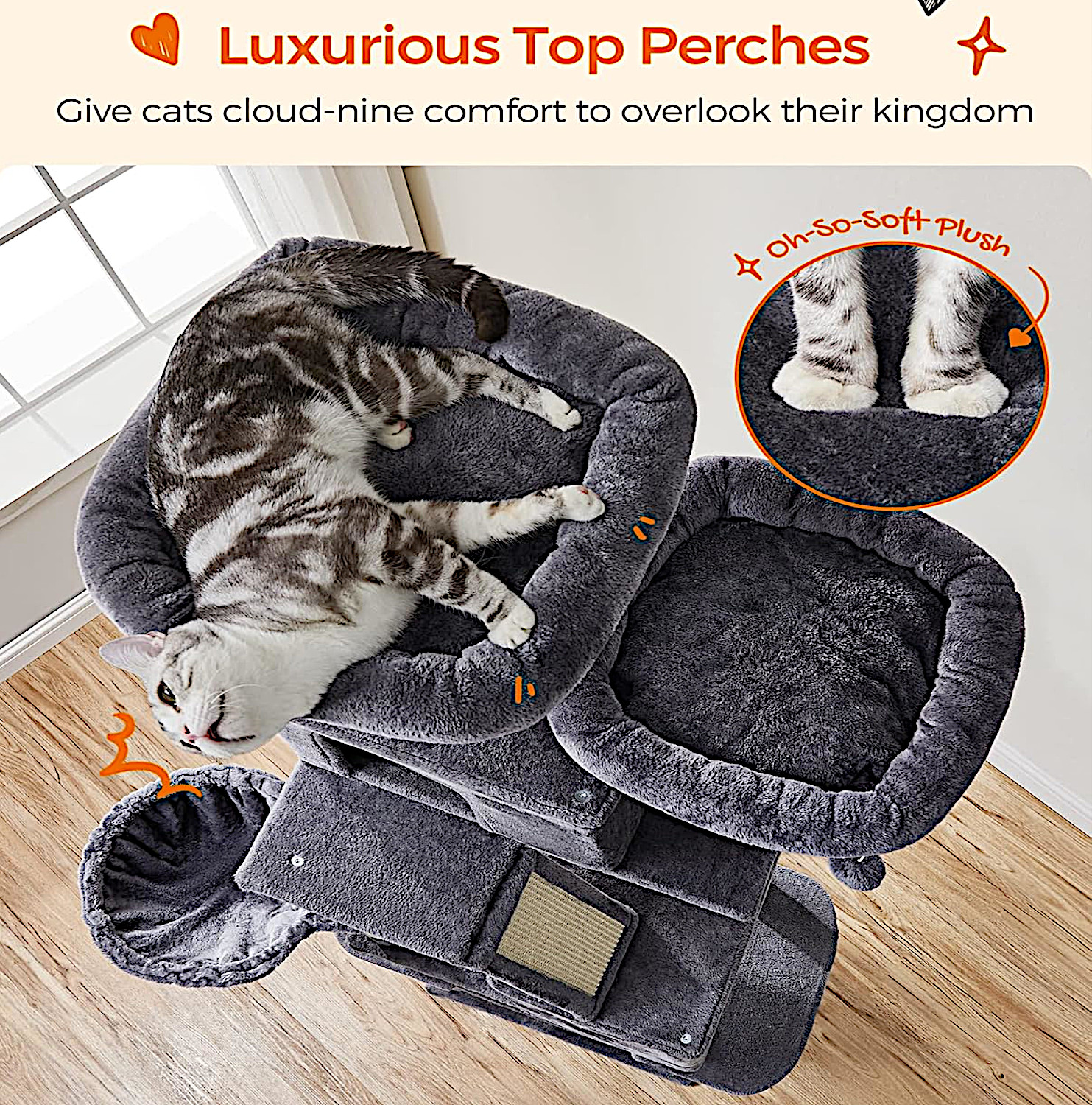 Standing at an impressive 81 inches tall, this cat tower offers five levels of climbing fun. With short 12–16 inch distances between levels, even kittens and senior cats can explore without struggle. For cats that crave the thrill of high places, this tree delivers the perfect balance of height and accessibility.
