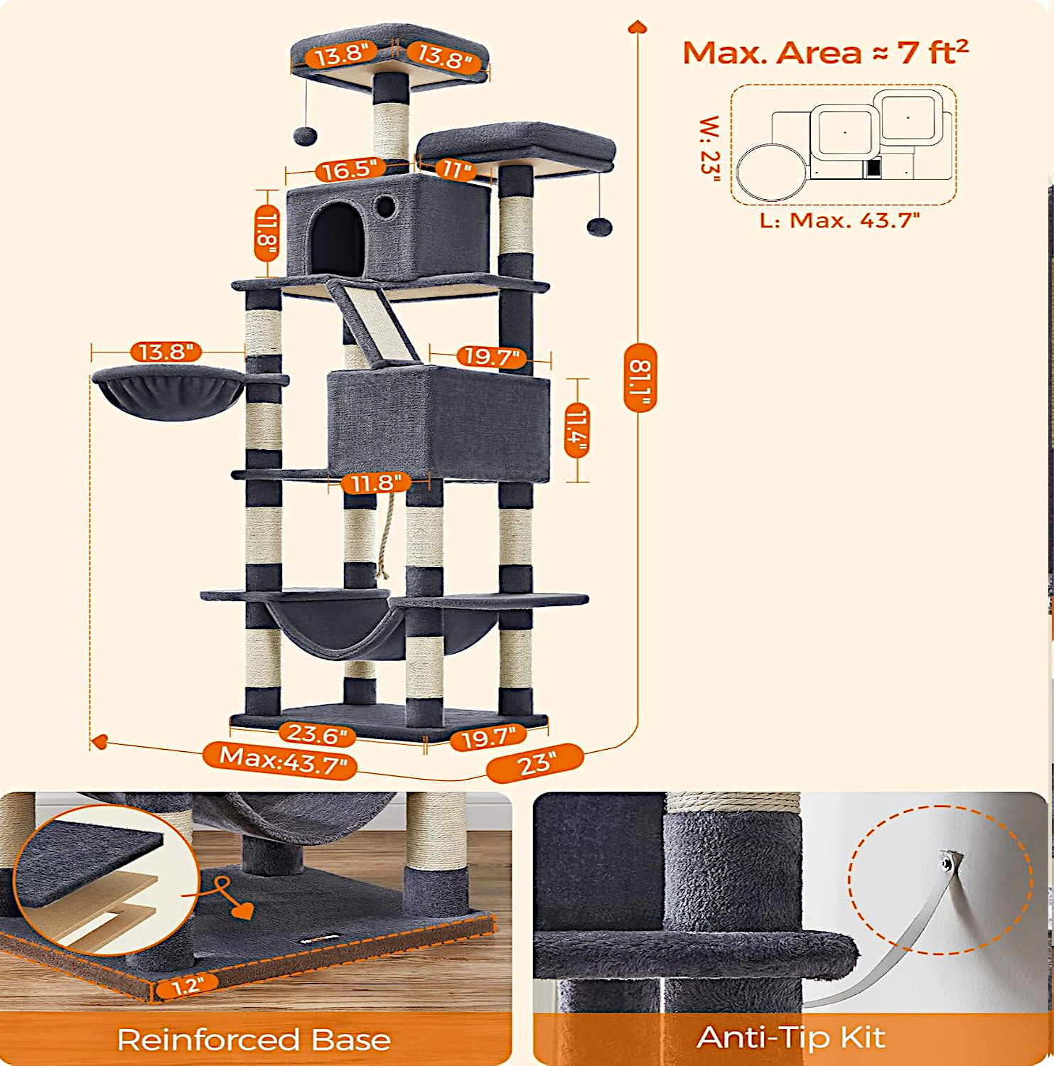 Every cat deserves more than just a cozy corner—they deserve their own kingdom. The 81.1-inch Large Cat Tree isn’t just furniture; it’s a complete playground designed to match the natural instincts of your feline friends while blending seamlessly with your home.